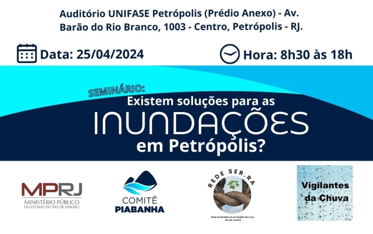 O Comitê irá promover um seminário com o tema “Existem soluções para as inundações em Petrópolis?”, a ser realizado no Auditório UNIFASE Petrópolis (Prédio Anexo), situado à Avenida Barão do Rio Branco, 1003 – Centro, Petrópolis/RJ, das 8h30às 18h.