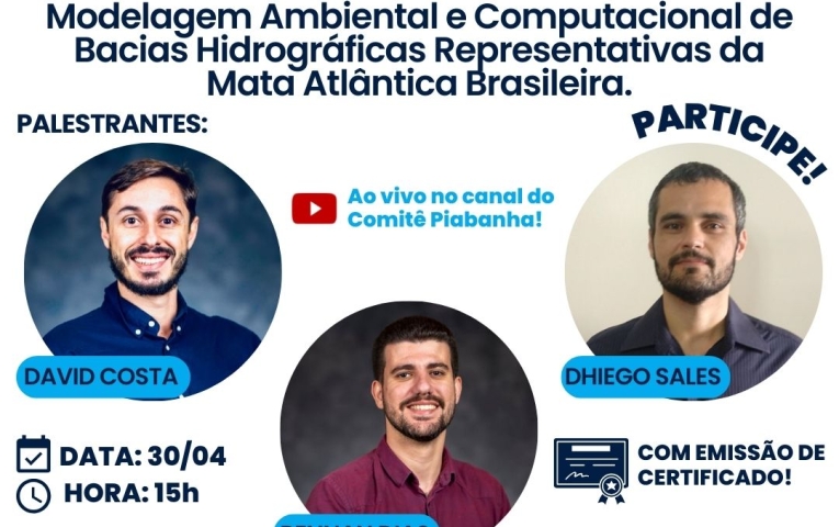 Nesta terça-feira, dia 30, a partir das 15h, será aberta para o público uma palestra de capacitação no canal do Comitê Piabanha no YouTube. O link de acesso deverá ser feito pelo link https://www.youtube.com/watch?v=bLKF_iLnzD0. O evento terá como tema “Modelagem Ambiental e Computacional de Bacias Hidrográficas Representativas da Mata Atlântica Brasileira”. Os assuntos dos blocos serão ministrados por David Costa, Rennan Dias e Dhiego Sales.