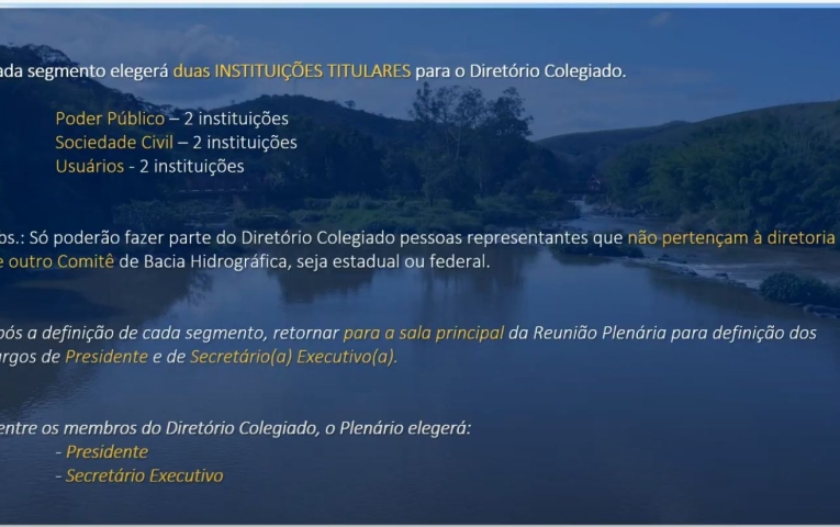 Já está em vigor o novo mandato do Diretório Colegiado do Comitê Piabanha, que irá se estender até o dia 28 de abril de 2026. A eleição ocorreu durante a 99ª Reunião Ordinária do Comitê, realizada em 16 de abril. Após consulta realizada aos membros, o Plenário decidiu pela manutenção da composição que estava em vigor, com uma reestruturação dos cargos. Após a eleição do Diretório Colegiado, se candidataram a Presidente e Secretária Executiva, respectivamente, Claudia Karina Wilberg de Castro Costa e Erika Cortines, que foram eleitas por unanimidade. Vale ressaltar que a vaga no Diretório Colegiado é da instituição. Somente os cargos de presidente e secretário são vinculados à pessoa que o assume.