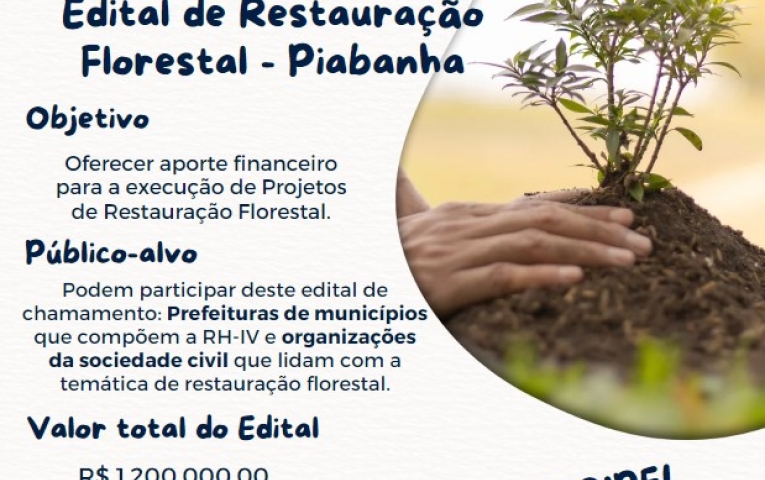 O Comitê Piabanha informa que foi publicado na data de hoje (06/06) o EDITAL DE CHAMAMENTO PÚBLICO Nº 05/2024 para manifestação de Interesse em Projetos de Restauração Florestal na Região Hidrográfica IV (Piabanha) no Estado do Rio de Janeiro, com foco em aporte financeiro para projetos de restauração florestal nos munícipios inseridos, total ou parcial, na área de atuação do Comitê Piabanha. O valor total aprovado para o Edital é de R$ 1.200.000,00 para financiar a execução dos projetos selecionados.