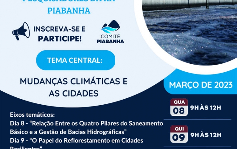 O Comitê Piabanha está com inscrições abertas para o VI Seminário de Saneamento e VII Encontro de Pesquisadores, que ocorrerá de forma 100% online com transmissão ao vivo pelo Canal do Comitê Piabanha no Youtube. O evento será nos dias 8, 9 e 10 de março.